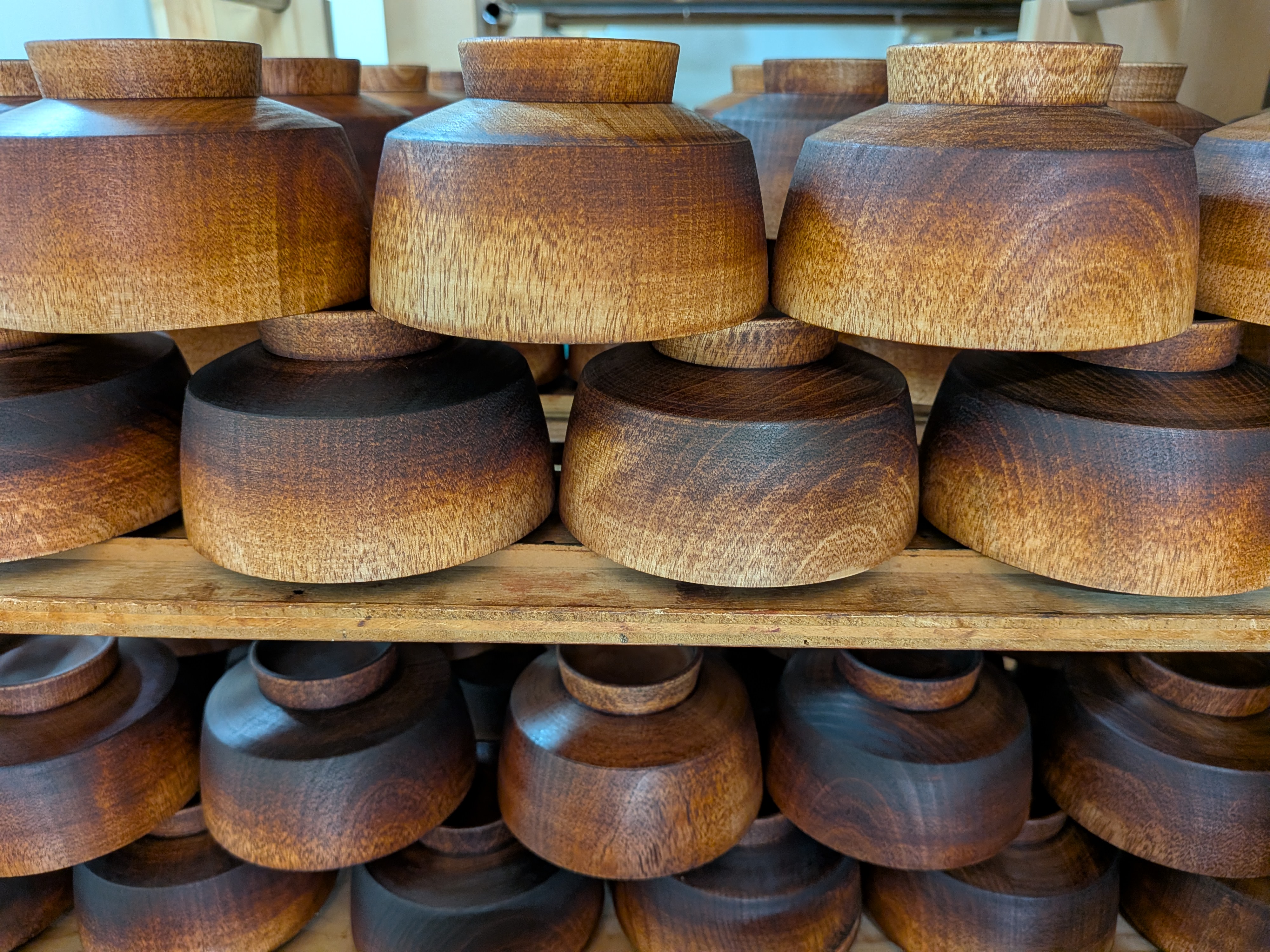 ※写真は木地を挽く様子と、木固め(木地に生漆を染み込ませる作業)したお椀。